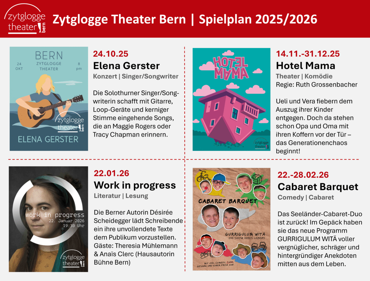 Nun lüften wir das Geheimnis: Ruth Grossenbacher inszeniert 2025 «Hotel Mama» – eine leichtfüssige Komödie von Jan-Ferdinand Haas! Das amüsante Theaterstück ist in einer Mundartfassung vom 12. November bis 31. Dezember 2025 im Zytglogge Theater Bern zu sehen.